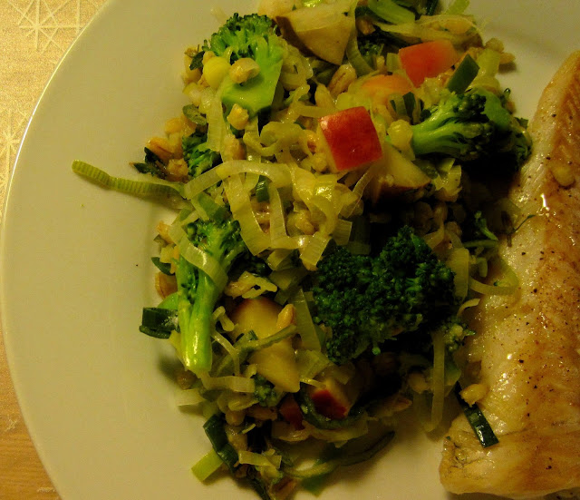 Tilsæt æble, pære og dampet broccoli og smag til med salt og peber. Vend til sidst perlebyg og frisk timian i blandingen og varm igennem under omrøring. Rør citronsaft og sennep sammen, hæld den over salaten og server. Velbekomme!