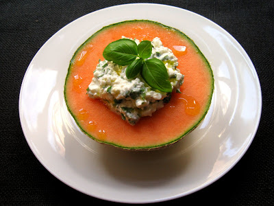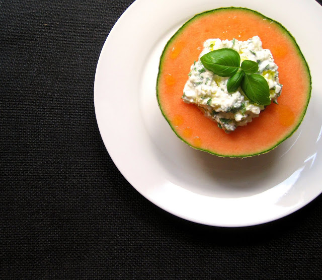 Fordel hytteosten i de to halve meloner, dryp med citronolie og server med godt brød.