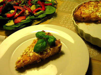 Denne tærte var lidt et eksperiment, men den endte faktisk med at blive vældig lækker (sagde min kæreste og indhalerede derefter en halv tærte. Er vel også en måde at underbygge sine påstande...). Hvis man ikke kan få fat i søde kartofler, vil jeg tro, at man kan erstatte dem med gulerødder.
