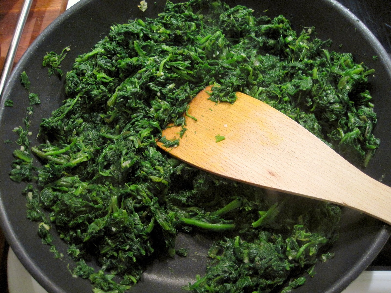 Svits hvidløg i lidt olie på panden, tilsæt spinat og lad det koge indtil væden er fordampet. Tag panden af varmen, rør hytteosten og smag til med salt og peber.