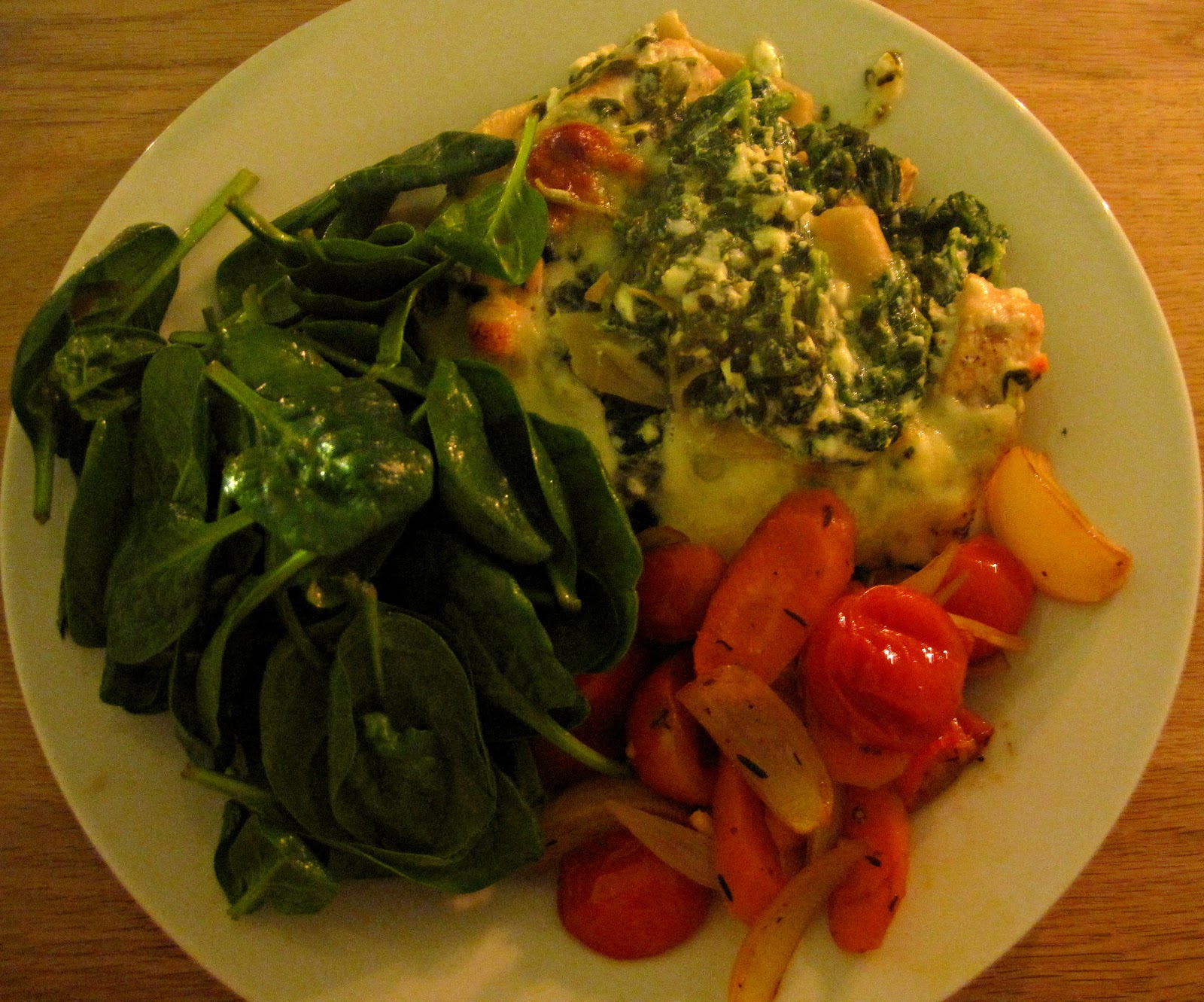 Smagen er forholdsvis mild og lidt syrlig, så man kan med fordel lave et sødligt tilbehør. Vi fik løg, gulerødder og cherrytomater, som blev vendt med olie, sirup, balsamico, timian, salt og peber og bagt i 45 minutter ved 200 grader. Og en grøn salat.
